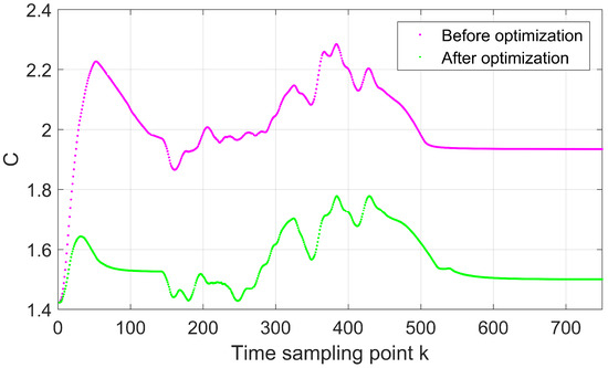 Aggregation coefficient of cluster 1 before and after optimization. The magenta dots and green dots respectively represent the clustering coefficients at each sampling point before and after optimization.