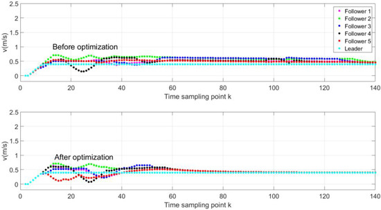 We select the cluster with a more complex structure on the left to compare the stability of the system before and after optimization. The aggregation coefficient before and after topology optimization is shown in Figure 10, and the speed before obstacle avoidance is shown in Figure 11. After optimization, the aggregation coefficient is significantly reduced, the position of the AGVs is relatively compact, The speed convergence is faster, and the stability is improved, which indicates the effectiveness of the optimization method.