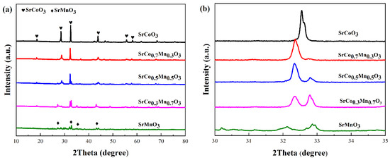(a) XRD patterns of the SrCoxMn1−xO3 perovskites. (b) A comparison with the pattern of the SrCoxMn1−xO3 perovskites.