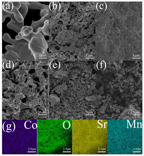 The 1μm and 5μm SEM images of SrCoxMn1−xO3. (a,d) SrCoO3, (b,e) SrCo0.5Mn0.5O3, (c,f) SrMnO3 perovskites; (g) EDS spectra of SrCo0.5Mn0.5O3.