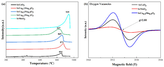 (a) O2-TPD of SrCoxMn1-xO3 perovskites. (b) EPR spectra of SrCoxMn1−xO3 perovskites.