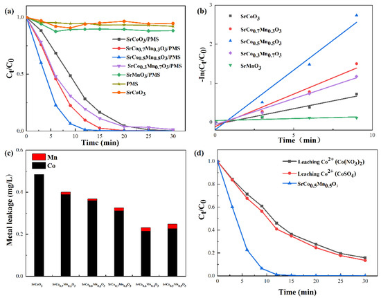 As a typical dye contaminant in wastewater, RhB was selected to evaluate the catalytic performance of perovskites for the activation of PMS. From Figure S5, sole PMS could oxidize only 10% of RhB, and the absorption capability of SrCoO3 (without PMS) for RhB was limited (only 10%) in 30 min, meaning the sole PMS or perovskite catalyst could only contribute in a limited way to the removal of RhB. When PMS was added simultaneously with SrCoxMn1−xO3, the concentration of RhB was reduced to close to zero within 25 min (Figure 4a), which showed that all SrCoxMn1−xO3 perovskites had high efficiency for PMS activation.