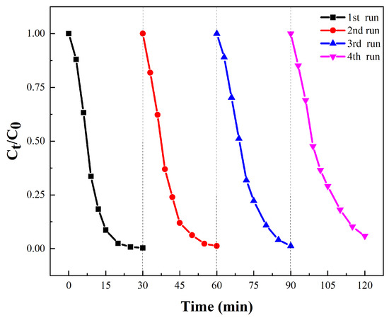 Reusability of SrCo0.5Mn0.5O3 for the degradation of RhB. Reaction conditions: [RhB] = 40 mg L−1, [PMS] = 0.06 mM, catalysts = 0.03 g L−1, T = 298 K.