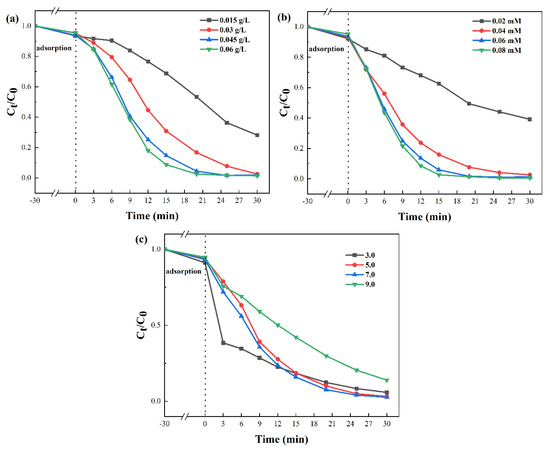 Effects of (a) catalyst dosage, (b) PMS concentration, and (c) pH on RhB degradation in SrCo0.5Mn0.5O3−PMS (PMS: 0.04 mM). Reaction conditions: RhB: 40 mg L−1, PMS: 0.06 mM, SrCo0.5Mn0.5O3: 0.03 g L−1, unless otherwise noted. T: 298.15 K. pH: nature.