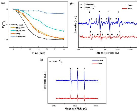 To further verify the results of the quenching effect, the EPR analysis was tested with the DMPO as a spin-trap agent for the generated radical and the ·OH radical, and TEMP for 1O2, respectively [61,62]. As shown in the Figure 7b, the characteristic peaks of the DMPO-·OH adducts (hyperfine splitting constants αH = αN = 14.8 G) and DMPO-(αH = 0.78 G, αH = 1.48 G, αH = 9.6 G and αN = 13.2 G) in 3 and 12 min were observed in the EPR spectrums, the upward trend in the catalytic process confirmed the sustained generation of active radicals. Meanwhile, the intensity of the DMOH-·OH adduct had a significant enhancement, and the DMOH- had only weak growth, indicating that it was continuously consumed, which caused the slightly left shift with the time [36]. Additionally, as shown in Figure 7c, three-line peaks were detected in the EPR spectrums with the relative intensities of 1:1:1, which matched well with the signals of the TEMP-1O2 adduct.