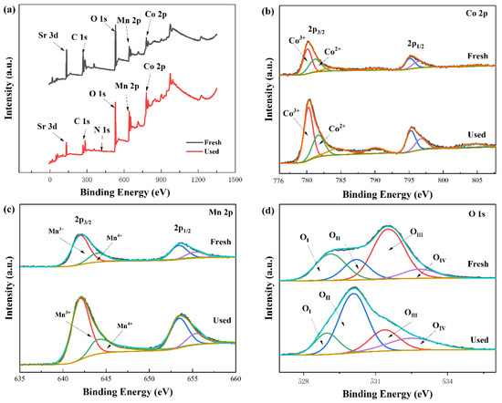 (a) survey XPS spectra of fresh and used SrCo0.5Mn0.5O3 perovskite. (b–d) XPS spectra of Co 2p, Mn 2p O 1s of fresh and used SrCo0.5Mn0.5O3 perovskites.