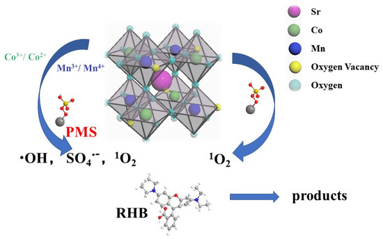 As a high electrophilic reactive oxygen species, singlet oxygen is gradually getting much more attention in recent research [65,66,67]. In general, singlet oxygen can derive from the decomposition of PMS in suitable pH (near pKa) [68] as Equation (12) shows. In this work, 1O2 could be generated through metal-based activators [69,70]. The oxygen vacancies could be converted into active oxygen(O*) and further changed into 1O2 (Equation (13)) with PMS. Meanwhile, the generated in the solution could react with H2O to obtain 1O2 (Equation (14)) also [71]. The , ·OH, and 1O2 radical generated in the SrCo0.5Mn0.5O3–PMS system acted together for RhB degradation. On the whole, the Mn species in the SrCo0.5Mn0.5O3 perovskite not only formed more oxygen vacancies but also participated in PMS activation as activate sites. The possible mechanism in SrCo0.5Mn0.5O3–PMS for removing RhB is depicted in Scheme 1.