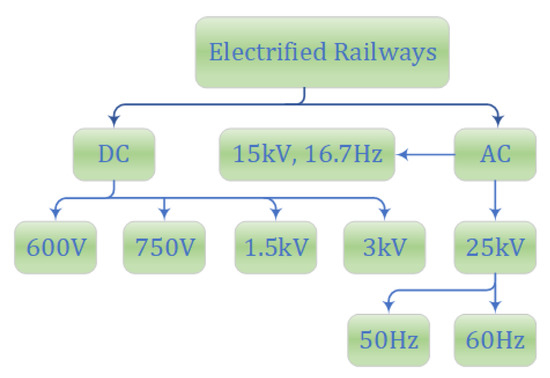 Electric rails are more reliable, quieter, and more powerful than fuel-based trains [9]. In recent decades, there has been a steady growth in railway electrification. At present, more than two-fifths of all railway lines across the world have been electrified. Three basic criteria are used to categorize the electrical systems in electrified railways: (i) Contact point: third rail, fourth rail, or overhead line through a catenary. (ii) Current: Direct Current (DC) or Alternating Current (AC). (iii) Voltage: Level and frequency. Different zones need separate infrastructures and systems. Numerous voltage schemes are used for electrified railways globally [10]. Some of the standard and non-standard voltage schemes used in electrified railways are mentioned in Figure 1. This shows that the electrified railways either deploy a DC source or an AC source to power the train. The DC sources may have different values depending upon the schemes, which may be 600 V, 750 V, 1500 V, or 3000 V. Similarly, the AC source may have different values as well as different frequencies. It may be 15 kV and 16.7 Hz, 25 kV and 50 Hz, or 25 kV and 60 Hz [11]. Different schemes are used in different places. The 750 VDC supply scheme has been adopted in this work.