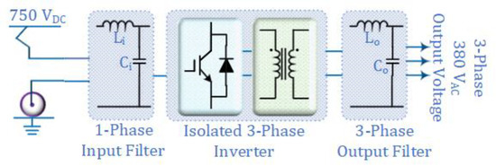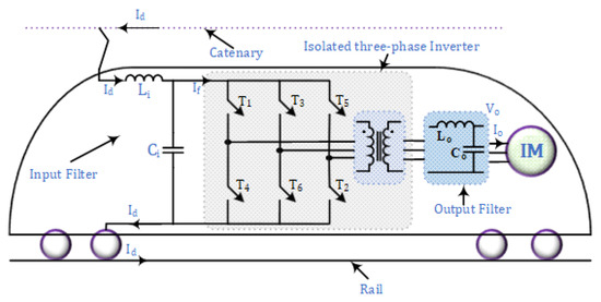A general AEPSS structure consists of an input filter, inverter, transformer, and output filter fed from an input DC supply to generate the desired output required for the load or other accessories. Figure 4 displays the schematic diagram of an AEPSS circuit structure in a single car. First, a 750 VDC supply is provided to the AEPSS input. This 750 VDC supply is provided through an overhead line conductor, which is received by AEPSS input using the catenary. This input supply is fed to the AEPSS input filter (Li and Ci), which eliminates the noise from the 750 VDC supply and stabilizes the voltage. Later, this input is converted to the three-phase alternating current power through an isolated three-phase inverter (ITPI). This ITPI may use any effective control strategy to produce three-phase AC power. A transformer is employed to provide the isolation. Furthermore, the three-phase alternating current power from ITPI output is filtered using the output filter (Lo and Co). Finally, a high-quality and stable three-phase 380 VAC/60 Hz is obtained from AEPSS output, fed to the air conditioning blowers induction motor (IM) and traction equipment blowers IM. The electrical specification of a general AEPSS is displayed in Table 1. It is evident from the table that the input voltage ranges from 550 VDC to 800 VDC while the output voltage is 3 phase 380 VAC with a frequency of 60 Hz. Additionally, the system power is 30 kW.