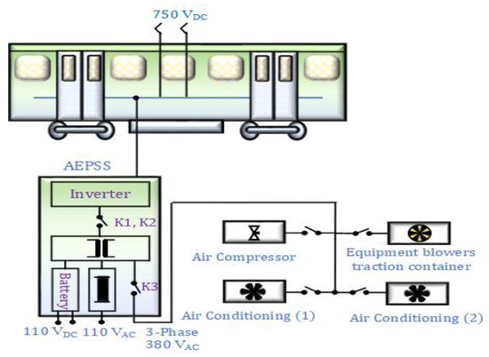 Among the various electrical systems of rail vehicles, auxiliary equipment power supply systems (AEPSS) have been emphasized in this study. It is very important to have a good AEPSS in rail vehicles. An excellent AEPSS can provide a stable and high-quality voltage supply for the rail vehicle’s electrical equipment, which will greatly improve the quality of passengers’ rides and avoid the AEPSS problem of causing any inconvenience to passengers. The rail vehicles provide certain facilities for the convenience of passengers to make the journey more pleasant. Various appliances are installed inside the rail vehicle for this purpose. Specified power supplies are required to operate these appliances. Some appliances need AC power, while a few of them require DC power since the input power is 750 VDC. Therefore, some kind of system must be provided that can be used to convert this power to the required specification. AEPSS are deployed in the rail vehicle to provide the power of the required specification for various appliances used inside the train. Some of the common appliances used inside the trains are air conditioners, air compressors, equipment blowers, batteries, and plug points for charging mobile phones, tablets, laptops, etc. Different appliances have different specifications. The AEPSS provides the specified power to operate those gadgets. Other trains may have different numbers of AEPSS installed inside cars depending on the number of cars and the train size. Figure 3 shows the rail vehicle AEPSS configuration in a medium-capacity rail vehicle system. This medium-capacity rail vehicle system consists of four power cars. One set of the AEPSS is deployed for each power car that produces a three-phase 380 VAC/60 Hz power source with a capacity of 60 kW [13], and the AEPSS output provides power to two air conditioning, an air compressor, and two equipment blowers traction container.