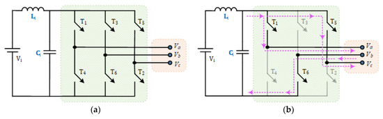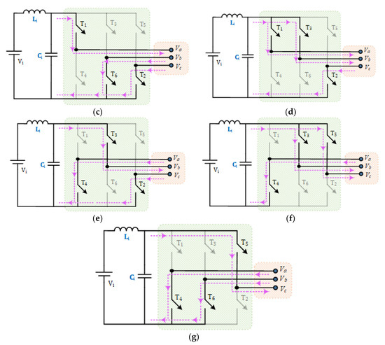 Various operating modes of AEPSS three-phase inverter. (a) No operation; (b) Mode-1; (c) Mode-2; (d) Mode-3; (e) Mode-4; (f) Mode-5; (g) Mode-6.