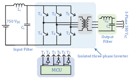 Numerous control strategies and optimization algorithms were proposed in the literature. Depending on the effectiveness, applications, and complexity of the control technique, the most effective and efficient control strategy can be used for switching the IGBTs in the inverters. These switching pulses control the duty cycle of each IGBT and thus produce the best result. Figure 6 shows the AEPSS architecture diagram with a microcontroller unit (MCU). The control unit employed a microcontroller to produce the switching pulses to control the conduction period of the IGBTs and thus regulate the output voltage. A 750 VDC supply is given at the input of ITPI through the AEPSS input filter (Li and Ci). The ITPI controller then adopts any control strategy to drive the six IGBTs T1, T2, T3, T4, T5, and T6 of the ITPI.