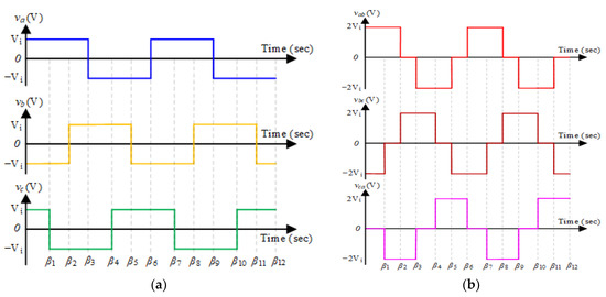 AC voltage square waveforms in different lines by implementing the traditional VCM (a) voltage of each line va, vb, and vc. (b) Voltage between two lines vab, vbc, and vca.