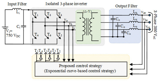 Figure 2 illustrates the architecture of the rail vehicle AEPSS. In this case, the load scale has been reduced to a lower value to perform experiment results in the laboratory. The 750 VDC is supplied either from the third rail or from the overhead conductor depending upon the supply system. This is passed to the isolated three-phase inverter (ITPI) through the AEPSS input filter (Li and Ci). The ITPI may either be the traditional or any other topology with some control strategy. However, the traditional ITPI has been used here because of its simplicity, fewer switch counts, and easy control. The Exponential curve-based (ECB) control strategy was proposed for controlling the output of the ITPI. The control strategy is based on the growth and decay of charge in the series RC circuit [15] and the harmonic elimination by detecting the Fourier expansion series of the AEPSS three-phase output voltage level [16,17]. The proposed ECB control strategy quickly adjusts each duty cycle to reach the best duty cycle and thus generates the best duty cycle for the ITPI driver. The output from ITPI is then passed through the output filter to obtain a high-quality and stable three-phase 380 VAC/60 Hz output. Finally, the desired output from the AEPSS provides the power supply to the rail vehicle air conditioning, air compressor, equipment blower, electric heater, plug socket, and lighting inside the coaches of the train, etc. [18].