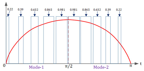 Mode-2: The second quarter of the output waveform is from π/2 to π. Since the second quarter of the output waveform should be symmetrical to the first quarter, it is necessary to change the parameter p and put its value into Equation (12) to evaluate the duty cycle. During this period, the parameters p are 4, 2, 1, 0.5, and 0.25, respectively. Thus, the corresponding duty cycles are 0.981, 0.865, 0.632, 0.39, and 0.22. Therefore, the IGBT of ITPI can be operated with the switching pulse of these duty cycles to generate an exponential output waveform from π/2 to π (as shown in Figure 13).
