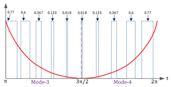 Mode-4: The fourth quarter of the output waveform is from 3π/2 to 2π. Since the fourth quarter of the output waveform should be symmetrical to the third quarter, it is necessary to change the parameter p and put its value into Equation (13) to evaluate the duty cycle. During this period, the parameters p is 4, 2, 1, 0.5, and 0.25, respectively. Thus, the corresponding duty cycles are 0.018, 0.135, 0.367, 0.6, and 0.77. Therefore, the IGBT of ITPI can be operated with the switching pulse of these duty cycles to generate an exponential output waveform from 3π/2 to 2π (as shown in Figure 14). Overall, Equations (12) and (13) are used to control the switching of the IGBTs in the ITPI and thus generating an exponential output voltage waveform.