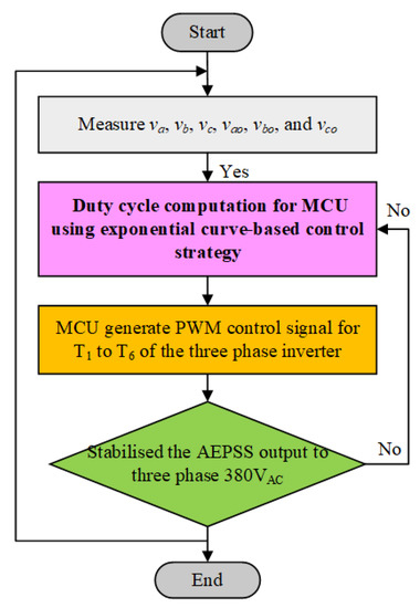 A flowchart is a pictorial representation of the various steps involved in a process. The working of the proposed ECB control strategy can simply be elaborated with a flowchart. Figure 15 depicts the flow chart of the proposed ECB control strategy for the AEPSS. Initially, the va, vb, vc, vao, vbo, and vco are detected and measured. The proposed ECB control strategy produces pulses to drive the IGBTs T1 to T6 of the ITPI. The three-phase output from the ITPI is isolated through a transformer and filtered using an output filter. Then, the AEPSS detects va, vb, vc, vab, vbc, and vca, ensuring that the ITPI output is a three-phase 380 VAC/60 Hz. If the output voltage is greater than or smaller than 380 V, MCU manipulates the duty cycle for each switch according to the proposed control strategy. This signal thus helps in controlling the output voltage closer to the desired voltage. This way, the proposed controlling strategy helps in producing a stable and high-quality output voltage.