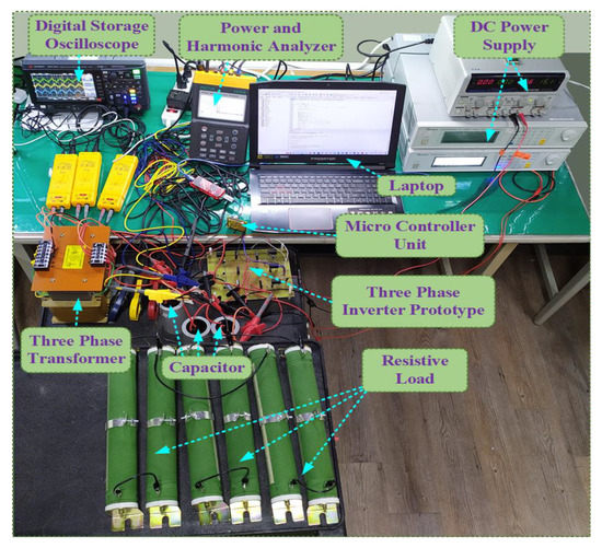 Since a single DC power supply can be used for a voltage up to 600 V only. However, 800 V has been required to perform this experiment. Therefore, two DC supply has been cascaded to increase the voltage specification of the DC supply. After cascading these two dc power supplies, this overall system can provide the DC supply up to 800 V. The three-phase output from the ITPI is then isolated using the transformer (1:1, Δ − Y), and filtered the output voltage by employing a capacitor in each phase to obtain a three-phase 380 VAC/60 Hz output. A load is connected at the output terminal to perform the testing and to evaluate the effectiveness of the traditional VCM and the proposed ECB control strategy. A digital storage oscilloscope has been employed for measuring the output voltage waveform using both the traditional techniques as well as a proposed control technique. A power and harmonic analyzer was used to measure and record the harmonic profile of the output voltage waveform. The specification of the experimental setup is shown in Table 4.