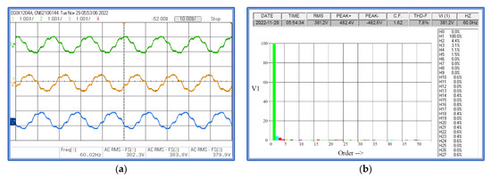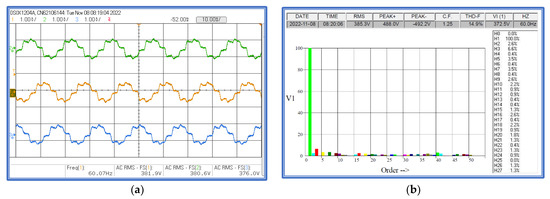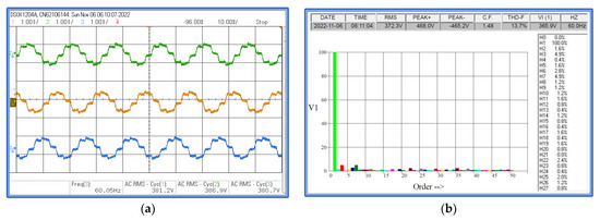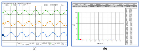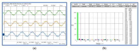 The output voltage Vo and harmonic profile of output voltage by the implementation of the traditional VCM with the input voltage Vi = 800 VDC are shown in Figure 19. The three-phase output of the ITPI is shown in Figure 19a. The orange waveform shows the output voltage in phase I whose RMS value is 381.9 VAC. The green waveform depicts the output voltage in phase II, whose RMS value is 380.6 VAC and the blue waveform shows the output voltage in phase III whose RMS value is 376.0 VAC. The frequency of the output voltage is 60 Hz. The harmonic profile of output voltage Vo is illustrated in Figure 19b. It shows that the RMS value of voltage in phase I is 385.3 VAC, the positive peak voltage is 488.0 V, the negative peak voltage is −492.2 V, and the THD of output voltage in phase I is 14.9%. The fundamental frequency of output voltage is 60 Hz.