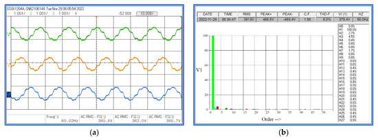The output voltage Vo and harmonic profile of output voltage by the implementation of the proposed ECB control strategy with the input voltage Vi = 800 VDC are shown in Figure 22. The three-phase output of the ITPI is illustrated in Figure 22a. The orange waveform shows the output voltage in phase I whose RMS value is 380.8 VAC. The green waveform depicts the output voltage in phase II, whose RMS value is 382.0 VAC, and the blue waveform shows the output voltage in phase III whose RMS value is 380.7 VAC. The frequency of the output voltage is 60 Hz. The harmonic profile of output voltage Vo isdepicted in Figure 22b. It shows that the RMS value of voltage in phase I is 381.9 VAC, the positive peak voltage is 488.6 V, the negative peak voltage is −489.4 V, and the THD of output voltage in phase I is 8.0%. The fundamental frequency of output voltage is 60 Hz.