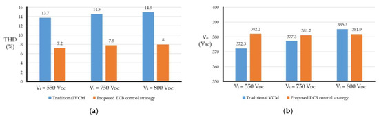 Comparison of the experimental result of the proposed ECB control strategy and traditional VCM: (a) voltage THD and (b) output voltage level.