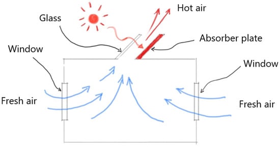 With the intention of promoting natural ventilation in buildings, Zavala-Guillé et al. [] numerically analyzed the use of a double-air-channel vertical solar chimney system in three different climates in Mexico on a summer day and found airflow increases of up to 63% compared to a single-channel solar chimney system. The solar chimney consists of a solar collector that heats the air inside; this increase in temperature decreases its density so that it tends to rise, thus sucking air from inside the building to the outside, which in turn draws in outside air through the windows, as shown in the scheme of Figure 1. A great variety of works demonstrate the performance of natural ventilation and provide theoretical or experimental solar chimney system performance results; however, there are few works on the integration of these systems into the total or partial volume of a housing model [,,,,,].