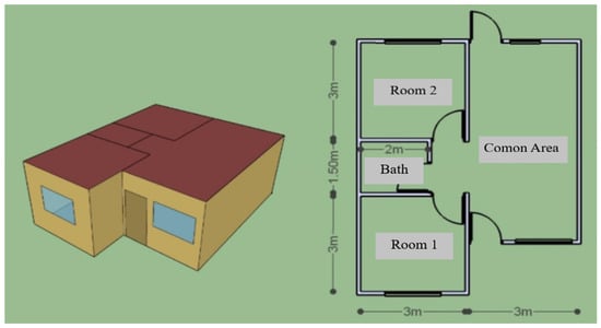 A standard model of a social interest house with two rooms, a bathroom, and common area (kitchen and dining room), with a total area of 39 m2 and a height of 2.7 m, was selected for the study. The layout of the house is shown in Figure 2. The area of each window is 1.5 m2 except for the rear window in the common area, which is 0.8 m2.