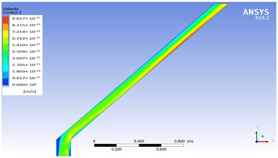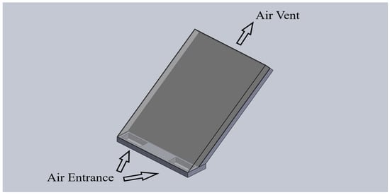 A solar radiation on the plate of 636 W/m2 was taken, which corresponds to a normal incidence of 900 W/m2; for the glass plate, a convection coefficient of 10 W/m2 Kas taken. A zero gauge pressure was defined at both the air inlet and outlet. To simplify the calculations, the wall in contact with the plate was taken as adiabatic, and finally, an ambient temperature of 20 °C was used, as shown in Figure 4. The 3D SolidWorks design and boundary conditions are shown in Figure 5.