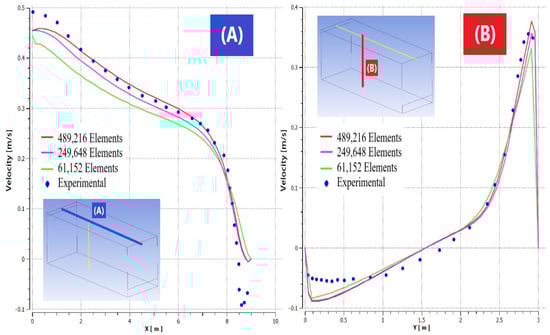 For the mesh independence analysis, a 5 cm mesh was analyzed, giving a total of 489,216 elements; another 10 cm mesh with a wall refinement of 5 cm was analyzed, for a total of 249,648 elements, and a final 10 cm mesh was analyzed for a total of 61,152 elements. The results were compared with the experimental data. These data were measured in a vertical line at 3 m from the origin and a horizontal line at 2.916 m from the floor level, as shown in Figure 6.