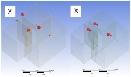 The simulation was performed in 3D, and the following two air outlet configurations were tested: a pair of circular channels was placed at the corners in front of the nearest air inlet (windows and doors) and another configuration with a rectangular channel was located in front of the air inlets, as shown in Figure 7.