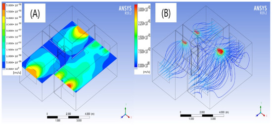 For this configuration, 1,574,584 mesh elements were generated, as shown in Figure 9, which shows the velocity magnitude in the plane for the general arrangement of the modules (air outlet of 83.5 g/s per room and 167 g/s for the area common), as in the plan for the circular channel. The magnitude is stronger at the entrances, but the change when integrated into the house is gradual, in addition to being concentrated in the central parts of the spaces. This distribution of the air flow can also be observed in the flow lines presented in Figure 9. The average speed with reference to the plane in the central part of each zone is 0.025 m/s.