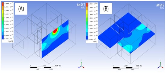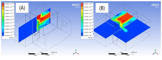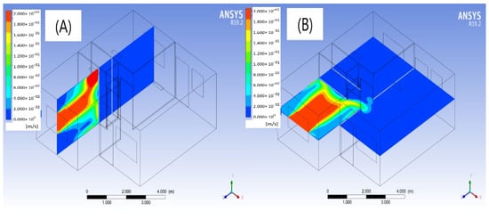 Velocity magnitude in the z–y plane (A) and in the z–x plane (B) for a rectangular channel, with the air outlet concentrated in room 2.