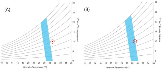 Displacement of the thermal comfort zone (in blue) in a psychrometric chart (A) without airflow and (B) with induced airflow. The red dot marks the coordinate for a relative humidity of 40% and temperature of 29 °C.