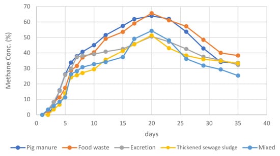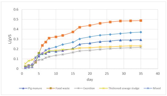 A BMP test was performed on each substrate, including food waste, pig manure, excretion, thickened sewage sludge, and mixed waste, to design a full-scale anaerobic digester that targets the methane production rates listed in Table 3.