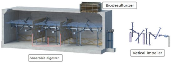 The client of this project, Seosan City, wanted to operate the anaerobic digestion facility stably. Therefore, they requested an HRT of more than 35 days, which is longer than the HRT of existing facilities in Republic of Korea, namely 20–30 days. They also wanted the anaerobic digestion tank to be designed with excellent durability. The design of this project reflects these requirements. The anaerobic digester was rectangular, installed with vertical impellers on the horizontal axis, and its HRT was over 35 days. It was a plug flow type with vertical agitation through a horizontal axis rotation (Figure 4 and Figure 5). Impellers were exposed to the surface to prevent scum and oil layer formation, and the agitation efficiency was high, making it suitable for high-concentration organic waste treatment. An all-in-one bio-desulfurizer was installed in the upper part of the anaerobic digester to reduce the capacity of the biogas use system at the rear.