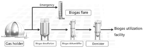 The biogas produced by the anaerobic digester was utilized in downstream biogas use facilities, such as ones for gas power generation, among others. A biogas refinery facility was installed to create a suitable condition (Figure 6). The gas holder had a capacity sufficient for 3 h of biogas production. Furthermore, a dry desulfurizer was installed using Fe(OH)2, a dehumidifier, and a demister. In addition, a flow meter and gas analyzer were installed to measure the biogas volume generated.