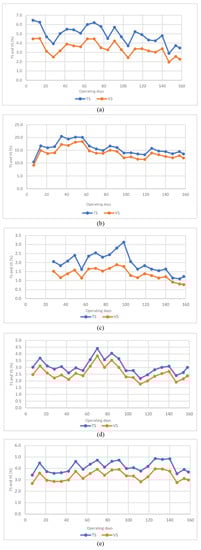 The solid content of the organic wastes (TS and VS) is shown in Figure 7. The planned pig manure content was 4.5% of the TS and 3.0% of the VS. However, the actual average inflow was 4.9% of the TS and 3.4% of the VS, slightly higher than the planned amount. The planned food waste content was 21.0% of the TS and 17.8% of the VS, whereas the actual inflow average was 15.7% of the TS and 13.9% of the VS. The planned excretion input was 3.15% of the TS and 2.31% of the VS. These were higher than the actual average inflow of 2.0% and 1.4%, respectively, because of rainwater inflow into the septic tank. The planned thickened sewage sludge input was 3.68% of the TS and 2.84% of the VS, and the actual inflow average was 3.1% of the TS and 2.6% of the VS. Lastly, the planned mixed organic content after pretreatment was 5.94% of the TS and 4.7% of the VS, and the actual inflow average was 70% lower at 4.1% of the TS and 3.3% of the VS. Although the amount of solid content of the organic waste was lower than planned, the total amount of solids content was not artificially adjusted for experimental reasons as this was a large-scale actual treatment facility rather than an experimental setup. The full-scale anaerobic digester was designed to handle high organic loads (3–4 kg VS/m3/day), so low organic loads below 1 kg VS/m3/day were not a problem. The average organic matter removal efficiency (volatile solids basis) was 64%.