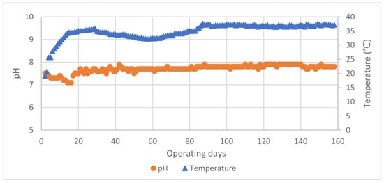 Factors that indicate the operating state of anaerobic digesters include HRT, pH, alkalinity, VFAs, TS, VS, T-N, NH4-N, gas production rate, and gas composition. The planned HRT was 35 days. During operation, the actual HRT was 42–68 days for the initial 98 days and 35 for the last 60 days, confirming that the planned HRT was maintained. Figure 8 presents changes in pH and temperature. pH and water temperature, the most important factors in the operation of the anaerobic digester, maintained stable values without significant changes throughout the period, except for during the early seeding stage. The average pH was maintained at 7.7 (highest, 7.9; lowest, 7.1), and the organic acid concentration was maintained at a low level of 356–802 mg/L after 30 days of operation. Water temperature was stable at 35–40 °C, a range of mesophilic digesters, from 80 days after initiating the operation.