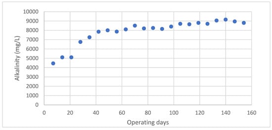 Figure 9 presents the changes in alkalinity, which was continuously maintained at >5000 mg/L after 20 days and at 8000–9000 mg/L after 40 days. The VFA/alkalinity ratio remained somewhat low at 0.04–0.06. The main factors of the anaerobic digestion tank were maintained throughout the operation, confirming that the mixed waste of pig manure, food waste, excretion, and thickened sewage sludge was treated with rigor. The organic loading rate of the digester gradually increased and maintained a monthly average range of 0.96–0.99 kg VS/m3/day after 65 days of operation and remained low at <1 kg VS/m3/day throughout the operation. Therefore, the organic matter removal rate was maintained at a low level, with an average of 64%. As the inefficiency of digester operation increases when the organic matter content of the inflow waste is low, managing organic waste intake is crucial to operating and maintaining the digester efficiently.