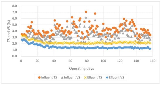 Figure 10 illustrates the changes in TS and VS, allowing us to determine the organic waste. Influent TS and VS were on average 4.2% and 3.4%, respectively. However, they deviated significantly throughout the operating period (TS, 2.8–7.2%; VS, 2.0–6.2%). From February to July 2020, a total of 158 days, four types of organic waste were introduced. Pig manure, food waste, and excretion were brought in on weekdays using a tanker truck. Thickened sewage sludge was introduced daily. Maintaining consistent inflow characteristics proved to be challenging during the operation of the full-scale facility. Despite significant variations in influent TS and VS, their average effluent concentrations were found to be 2.2% (ranging from 2.0% to 3.3%) and 1.5% (ranging from 1.2% to 1.5%), respectively, over a normal operating period of 60 days. The average organic matter removal efficiency (volatile solids basis) was 64%.