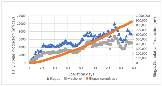 It was planned to introduce 320 m3/day of organic waste into the facility as a mixture of four substrates (pig manure, food waste, excretion, and thickened sewage sludge). However, for various reasons (Seosan City faced delays in securing organic waste transport vehicles, especially for food waste, because the contract with the existing waste disposal companies had not yet expired), <70% of the planned volume as obtained during the first three months. Later, over 90% of the planned volume was transferred to the facility. The removal of organic waste over 158 days is presented in Table 5.