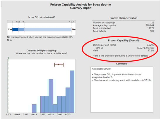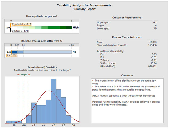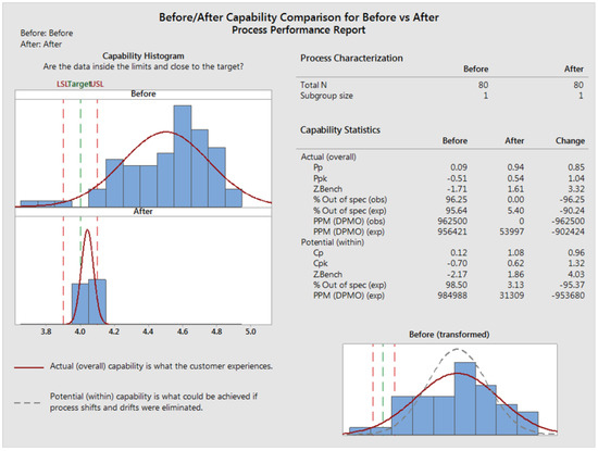 This performance ratio shows that the standard deviation has been significantly reduced (Figure 22). The process mean has changed too: the actual overall capacity is what is in line with the customer’s experience, and the potential capacity is what could be achieved if the process shunt changes were eliminated. The scarp obtained for the studied process was observed (Table 9) after the solutions had been used for 22 days.
