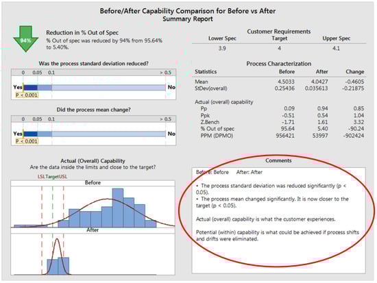 Minitab software was used to compare the first set of measurements with the second set of measurements taken after the implementation of the solutions.