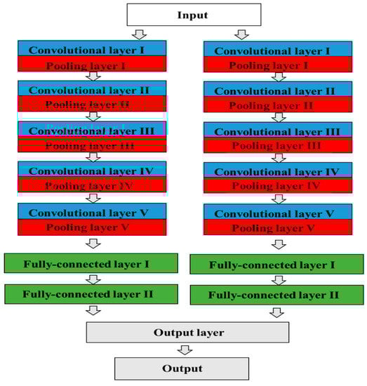 49]. This structure has five convolutional layers, some of which have max pooling layers. In addition, three fully connected layers with softmax functions are used for the output layer, so AlexNet contains eight layers in total. It is a variant of a CNN design published by Yann LeCun et al., and it applies backpropagation to Kunihiko Fukushima’s CNN architecture called Neo cognition [