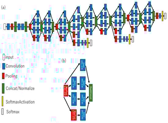 69]. The main feature of GoogLeNet is the Inception module, a small network that consists of multiple convolution layers, which convolve the original input image, and pooling layers, which reduce the original image while retaining important information. A large CNN can be constructed by stacking several Inception modules. The Inception module actively uses 1 × 1 convolutions—also called a bottleneck layer or pointwise convolution—which is a method for calculating by dividing the convolution into vertical and horizontal directions. The convolution in each channel direction has the same effect as dimensionality reduction, which reduces the number of calculations, and multiplex layers apply various transformations and concatenate them all together. This improves the drawback of CNNs, in which the image size decreases as the convolutional layers become deeper. Approximating the result with a small group of convolutional filters improves the trade-off between the expressiveness of the model and the number of parameters. In the convolution layer, this number is given by the number of input channels × number of output channels × kernel size, excluding the bias term. A normal convolution is dense because all parameters have some value, but Inception does independent convolutions of different sizes, which greatly reduces the number of non-zero parameters by applying multiple convolution layers in parallel and finally concatenating and processing the result of the computations.