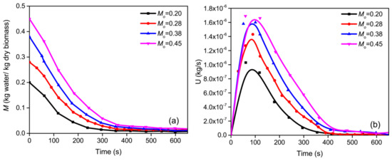 Figure 3 shows the effects of initial moisture content on the biomass drying process at 120 °C. As shown in Figure 3a, the moisture content at the end of drying increased with the increase in Mo in the tested range. For example, the final moisture content was 0.01736 for drying at Mo = 0.45, whereas it was only 0.00741 for Mo = 0.20, as decrease of 57.32%. This phenomenon probably resulted from the fact that the drying time increased with the increase in Mo. Therefore, the final moisture content increased with the increase in Mo within the same time. Similar results have been reported by other authors [19].
