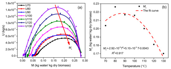 The critical moisture content (Mc) is the dividing point between the rising rate period and the falling rate period, and is an important parameter in the design of a dryer [13]. The plots of the drying rate and the drying temperature for the biomass are shown in Figure 5a. As seen from Figure 5a, the drying process can be divided into three periods, namely, the rising rate period (0–0.15 kg water/kg dry air), the constant rate period (0.15–0.22 kg water/kg dry air), and the falling rate period (0.22~0.28 kg water/kg dry air). However, the constant drying rate period was not obvious in all drying conditions. The rising rate period was very short and only occurred at the beginning of the drying process, and the falling rate period was the main drying process. The results proved that internal diffusion dominated the moisture transfer in the biomass material, and the volume shrinkage of the biomass and the destruction of colloid caused the drying decrease during the falling rate period. Similar results have been reported by different authors [25,35]. The distribution of the critical moisture content for different drying temperatures is presented in Figure 5b. As illustrated from Figure 5b, as the drying temperature increased, the distribution of Mc slowly increased first and then dramatically decreased. The maximal value of Mc was 0.226 kg of water/kg of dry biomass for 80 °C, the minimal value of Mc was 0.170 kg of water/kg of dry biomass for 130 °C, a decline of 24.78%. The distribution of Mc for different drying temperatures shows a non-linear relationship. The corresponding parabola fit, with R2 = 0.917, was given by: