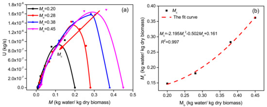Figure 6a shows the drying rate curves of the biomass with different initial moisture contents. As illustrated in Figure 6a, increasing the initial moisture content in the tested range significantly increased the value of Mc. The distribution of critical moisture content for different Mo is presented in Figure 6b. As seen from Figure 6b, the value of Mc increased with the increase in Mo. The maximal value of Mc was 0.362 kg of water/kg of dry biomass for Mo = 0.45, the minimal value of Mc was 0.148 kg of water/kg of dry biomass for Mo = 0.20, a decline of 59.12%. Therefore, compared to the drying temperature (24.78%), the initial moisture content had a more remarkable impact on Mc. The parabolic relation between the critical moisture content and the initial moisture content was decided using the experimental fit method. The fit R2-value of the fitting for Mo (R2 = 0.997) was higher than for the drying temperature (R2 = 0.917). The corresponding parabola fit was given by: