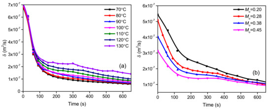 Figure 7 presents the distribution of effective diffusivity during the drying process. The distribution of effective diffusivity for different drying temperatures is illustrated in Figure 7a. From Figure 7a, it is obviously observed that the effective diffusivity of all of the tested samples constantly reduced with the increments in drying time. The evolutions of effective diffusivity could be divided into two periods, namely, the dramatically falling period and the slowly falling period. The dramatically falling period was observed from 0 to 100 s in a narrow time range, in which the free water was rapidly evaporated. The drying temperature had a marginal effect on the effective diffusivity during the dramatically falling period. However, the effective diffusivity obviously increased with the increase in drying temperature during the slowly falling period. The plausible reason for this phenomenon could be explained by the fact that the internal temperature gradient was small, but the change in temperature was significant in a short time, so the internal thermal stresses were great enough to cause the particle to have a maximal value of δ at t = 0. As the drying time increased, the change in temperature decreased, and the internal thermal stresses declined. Therefore, the value of δ decreased. However, the internal thermal stresses were so great that the drying temperature had a marginal effect on the effective diffusivity during the dramatically falling period. The internal thermal stresses reached equilibrium with increased drying time. At this time, the internal thermal stresses had a marginal effect on the effective diffusivity during the slowly falling period. However, with the increase in gas temperature, the average kinetic energy of gas molecules increased, so the diffusion was accelerated. Therefore, the value of δ was increased during the slowly falling period.