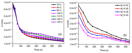 The coefficient of mass transfer can reflect the enhancement degree of the specific mass transfer process. Figure 8 shows the distribution of the mass transfer coefficient during the drying process. As presented in Figure 8, it was obviously observed that the mass transfer coefficient of all of the tested samples was constantly reduced with the increments of drying time. These results illustrated that the effective diffusivity of the biomass material rapidly decreased with the increase in drying time. Therefore, the value of β dramatically decreased. The evolutions of the mass transfer coefficient were similar to the evolutions of the effective diffusivity, as illustrated in Figure 8. The relationship between the mass transfer coefficient and the effective diffusivity is presented in Equation (12). The values of Sh and dp were constant values with the increase in drying time; therefore, the value of β had an obviously positive correlation with the value of δ, and the evolutions of β were similar to the evolutions of δ.